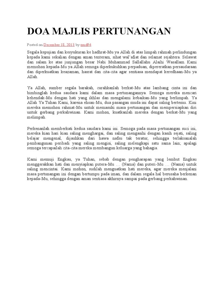 Doa untuk pengantin baru dalam bahasa melayu. Selawat ke atas nabi muhammad saw. اللهم يا ربنا لك الحمد كما ينبغي لجلال وجهك وعظيم سلطانك. Ya allah berkatilah majlis pertunangan ini limpahkanlah baraqah dan rahmat kepada . Skrip doa untuk pengantin di majlis perkahwinan isda . Among them is this doa selamat majlis pertunangan that can be your partner.